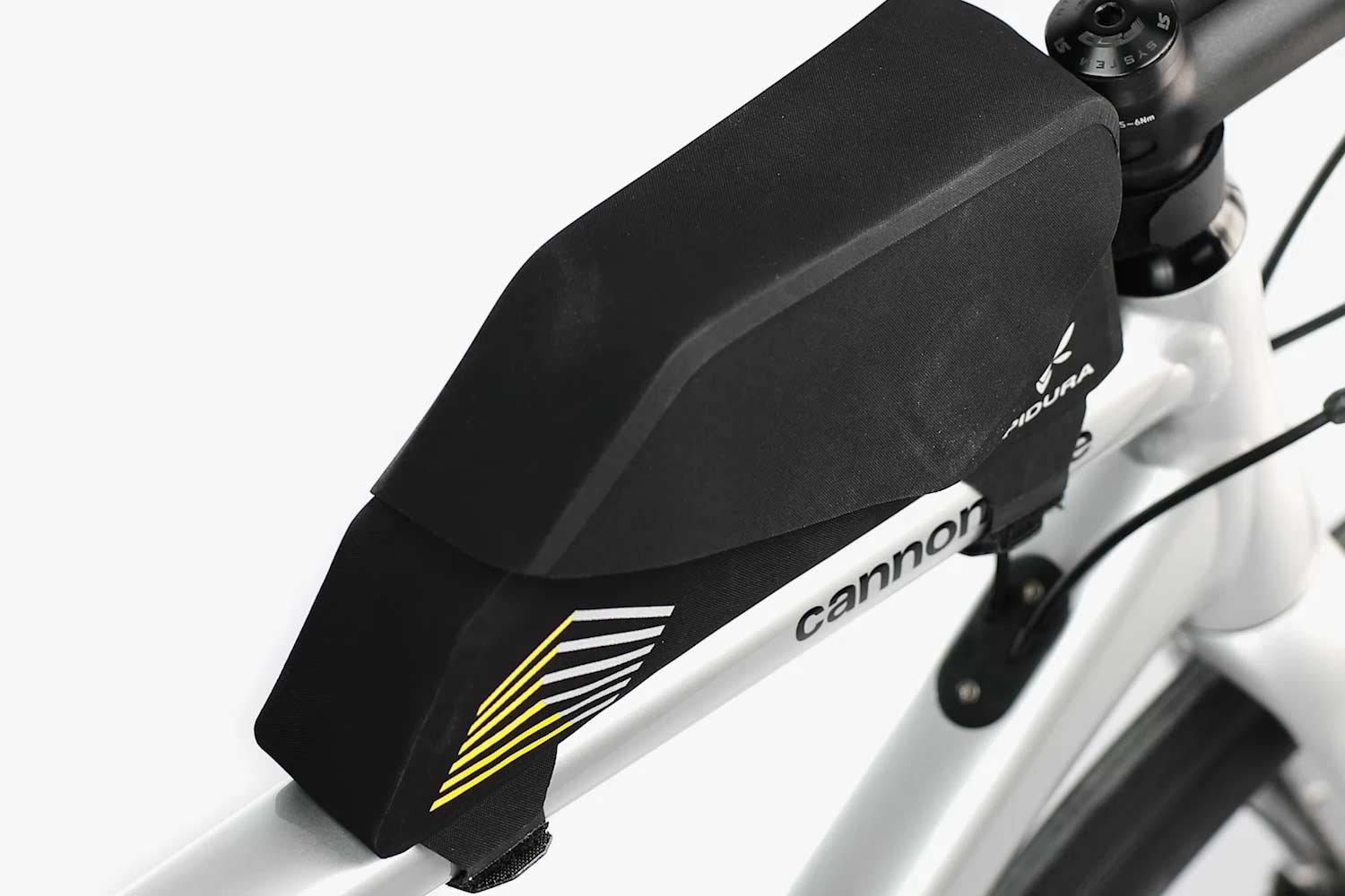 Système de fixation : 2 sangles Velcro renforcées en Hypalon pour fixation sur tube supérieur et devant le tube de direction