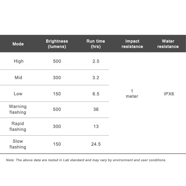 The RAVEMEN FR 500 offers powerful nighttime front lighting with 500 lumens, ideal for safe night-time riding. Its two high-efficiency LEDs ensure optimum light projection, while the six lighting modes adapt to any environment. The eye-catching daytime flashing function also guarantees maximum visibility during the day.