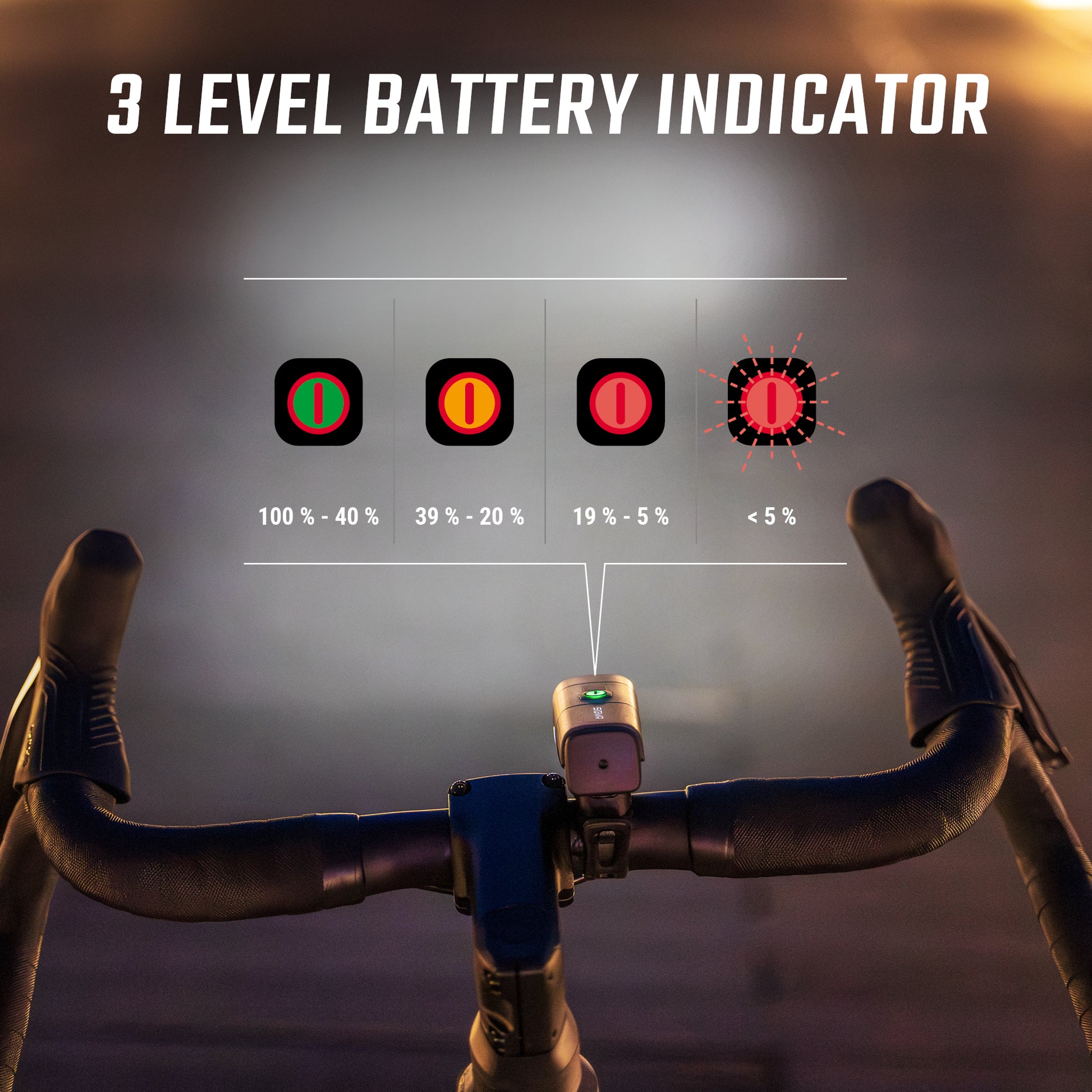 Practical and robust, the AURA 40 can be mounted without tools thanks to its 360° adjustable silicone support with Quick Release system. Splash-proof to IP44 standards, it accompanies cyclists in all weathers. Last but not least, its three-level LED indicator lets you check battery status at any time.