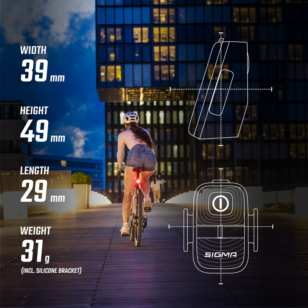 Crossing the city safely becomes child's play with the SIGMA HIRO 10rear light. Compact and lightweight, it offers impressive visibility for up to 500 meters, complemented by a 240° angle for all-round visibility. StVZO-approved, it guarantees maximum reliability in everyday use.