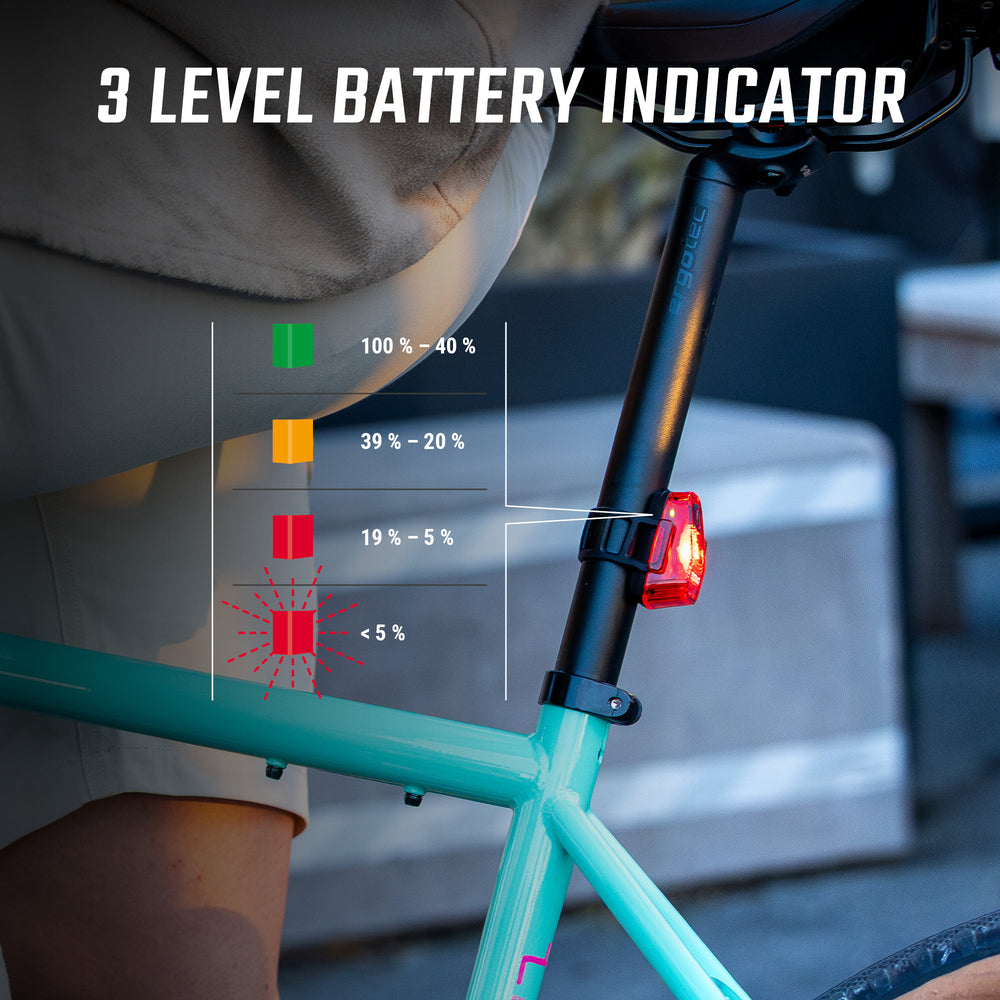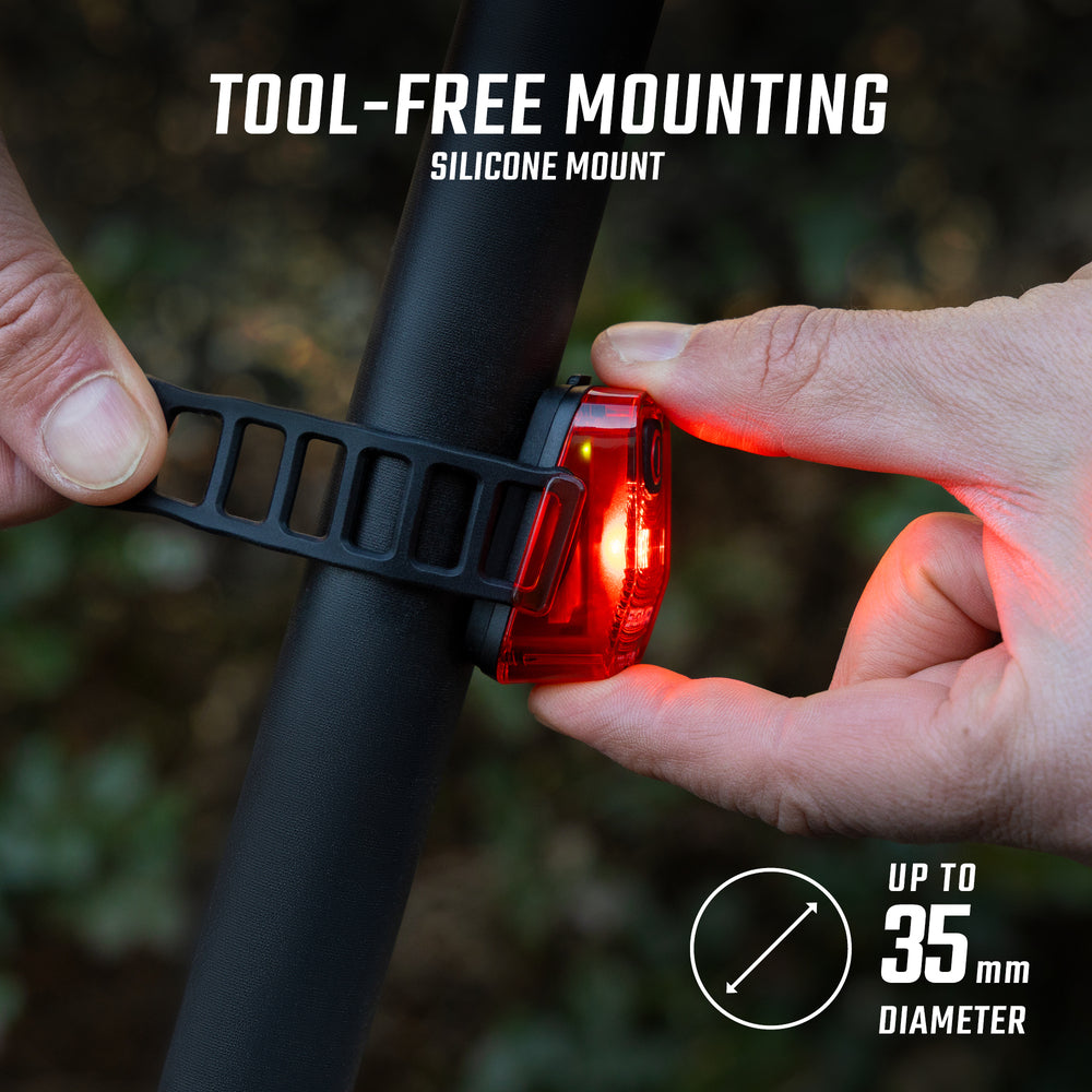 Designed for urban cyclists, this rear light attaches quickly to any seatpost thanks to its silicone band, without the need for tools. Waterproof to IP44 standards, it resists water splashes and accompanies your journeys whatever the weather conditions.