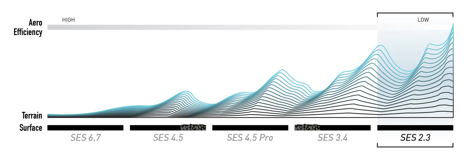 Den er indbegrebet af de bedste klatreres "Fast and Light"-filosofi: Fjern hvert eneste overflødige gram uden at gå på kompromis med ydeevnen ned ad bakke. Inspireret af det gennemprøvede design af SES 3.4 bruger SES 2.3 en differentieret tilgang mellem for- og baghjul for at optimere aerodynamikken i forhold til luftstrømmen. Forhjulet er designet til at give fremragende stabilitet i sidevind, hvilket er afgørende for at bevare kontrollen i bjergene.