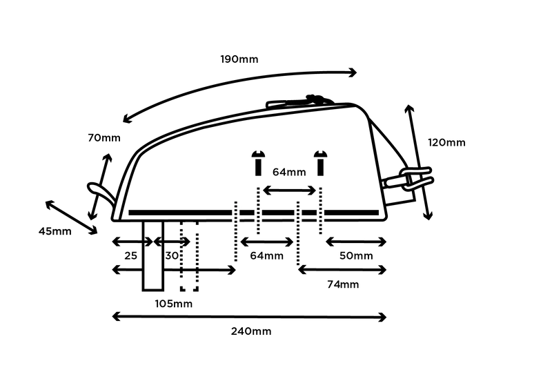 Den er 100 % vandtæt og kompakt, designet til at passe til alle stel og headsets og kan justeres ved hjælp af en justerbar strop (aftagelig) eller stellets skruesystem på overrøret. En stiv indvendig plastikstruktur holder tasken oprejst og stabil. Den har indvendige lommer til at organisere dine ejendele. Der er YKK-lynlåse for hurtig adgang til dine ejendele og refleksdetaljer for bedre synlighed.