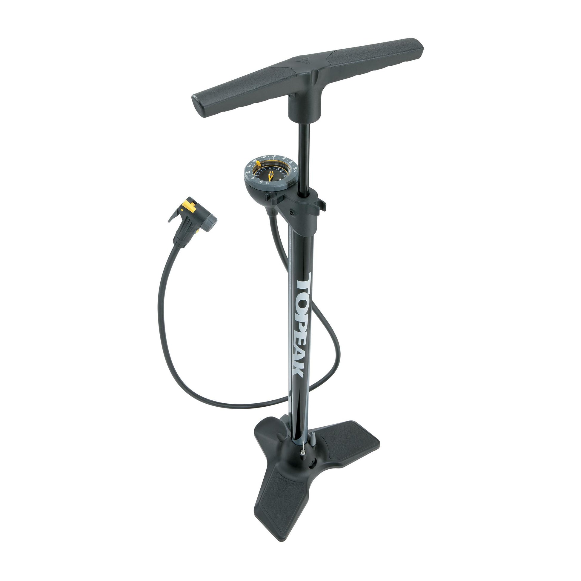 Den brede base sikrer stor stabilitet, mens den 142 cm lange slange gør den nem at bruge, selv når cyklen står på et værkstedsstativ.